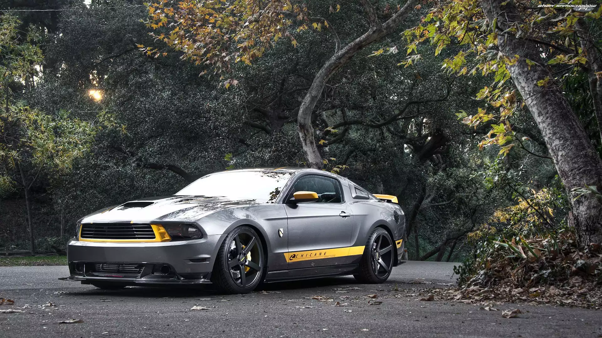 Samochód: Mustang, Drzewa, Ford, Droga